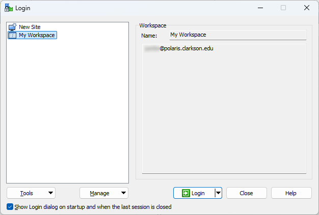 The next time you launch WinSCP, you will see the Login screen with "My Workspace" listed.