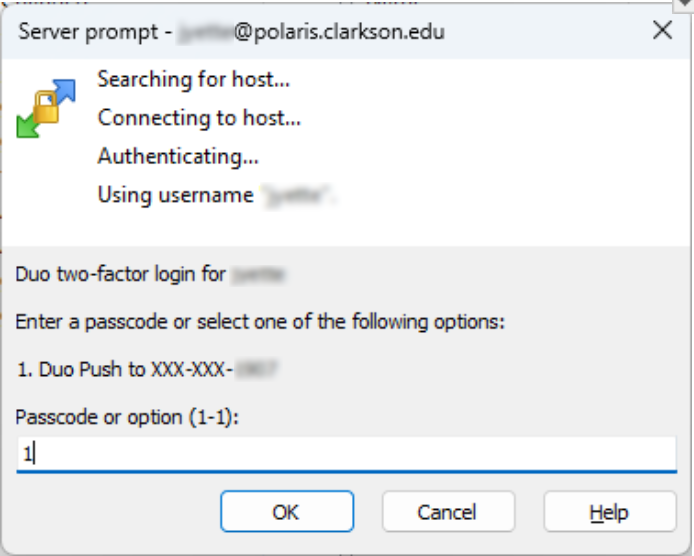 | At the next Server prompt window, you can either enter a DUO passcode if you have one, or enter 1 to receive a Duo Push authentication. Click OK. |