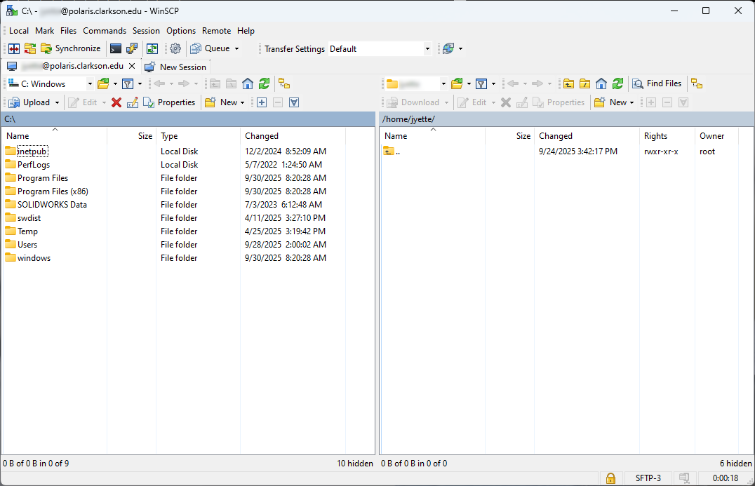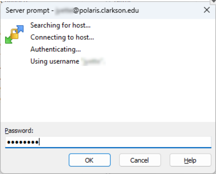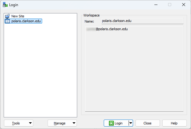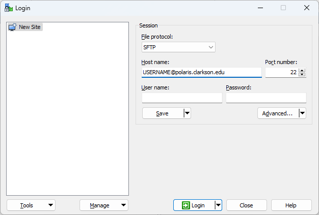 File Protocol should be set to SFTP Host name is in the format: USERNAME@polaris.clarkson.edu Port: 22
