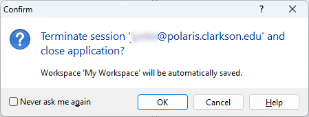 | When closing WindSCP, you will get a Cofirm window indicating that your session will be terminated and "My Workspace" will be automatically saved. |
