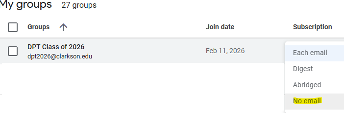 - From the list of groups shown to you find the list you wish to not receive email from.