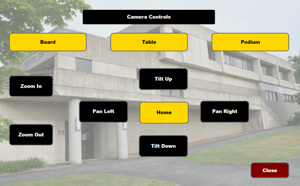 There are four (4) cameras in each room. There is a controllable Pan-Tilt-Zoom (PTZ) camera mounted in the rear of the room facing the instructor, there is a front center 180° camera which is selectable for part classroom instruction purposes, and then there are two additional 180° cameras mounted above the front entrance door for security use.