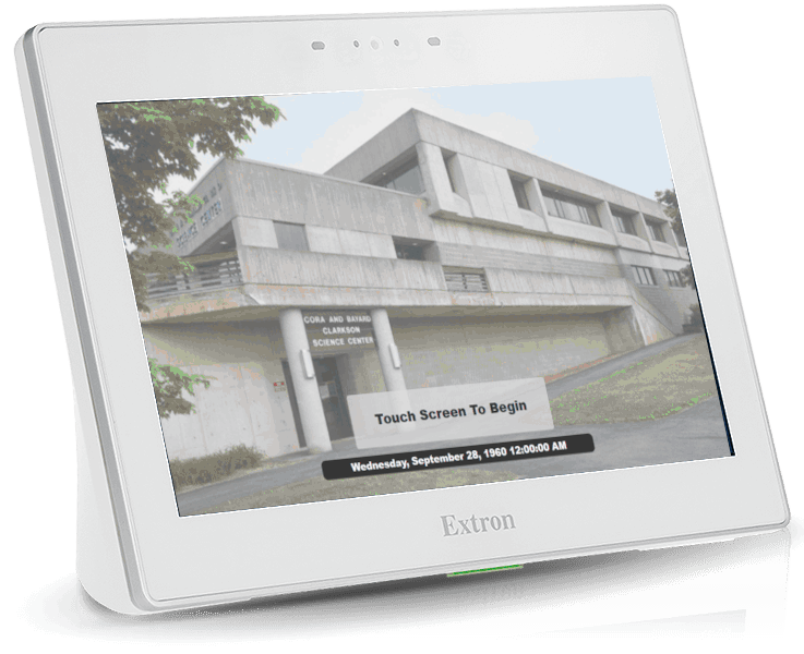 | Extron 10" Touchpanel controller. Each room has a touchpenl control that will "wake up" when it detects motion near it. So as you approach the podium, the display will light. If the system is currently off, a "Touch Screen To Begin" message will be on the screen. Doing so will turn on the projectors in the room and set all of the audio levels to their initial starting volumes. |