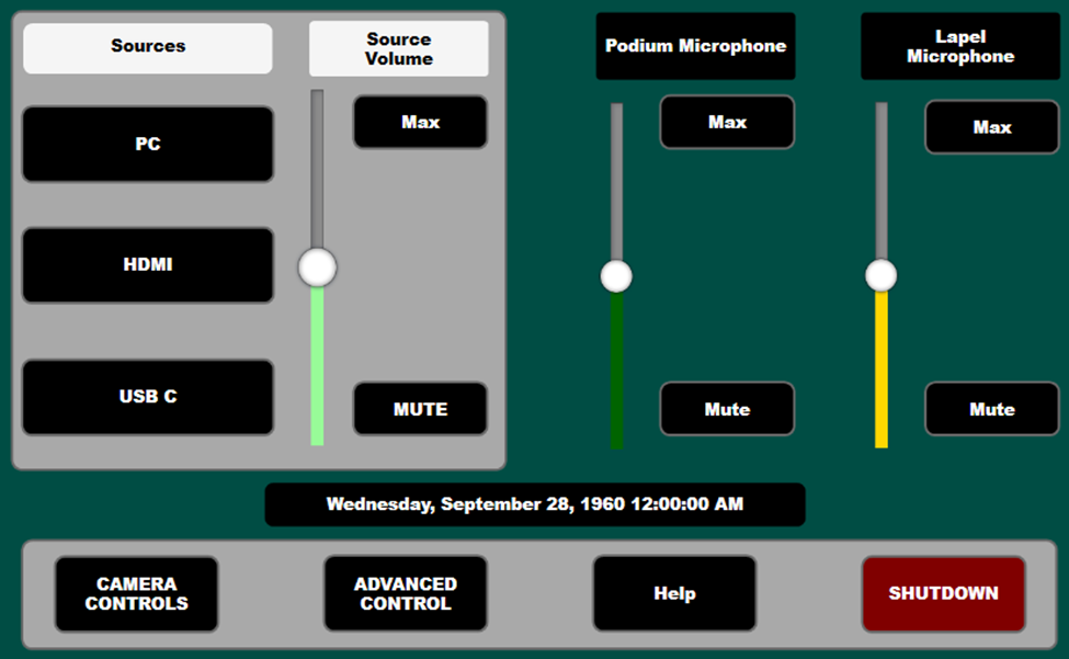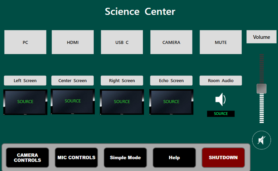 | Simple Mode Each room has two modes - Simple & Advance. The default screen that you will see once the system starts-up is the Simple Mode screen. From you, you can select your display Source - either PC, HDMI, or USB-C. Once selected, the same image will appear on the three student facing displays. You can also adjust the Source volume - this is the amount of room amplification for any audio coming from the source you selected to be displayed. Podium & Lapel Microphone levels - from here you can adjust the amount of room amplification for the podium microphone using the slider, or you can use the Max & Mute buttons for quick adjustments. NOTE: Muting a microphone is only muting the in-room amplification. The microphones are always active for any Echo classroom capture sessions. |