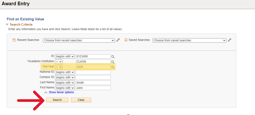 Input the Student's ID in the ID box, if you do not know the students ID, you can search them by first and last name in the indicated boxes. Type the aid year into the box, then click 'Search'.