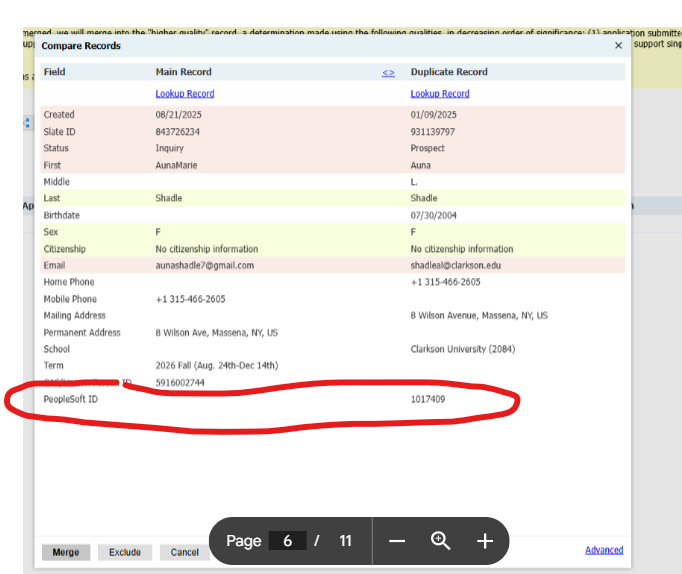 PLEASE MAKE SURE YOU ARE CHECKING THEIR PEOPLESOFT ID…IT’S THE LAST LINKE ON THE FILE…IF THEY ARE DIFFERENT DO NOT MERGE THE FILES AND LET AMY NEVER KNOW THAT THEY ARE DIFFERENT. ANEVIN@CLARKSON.EDU