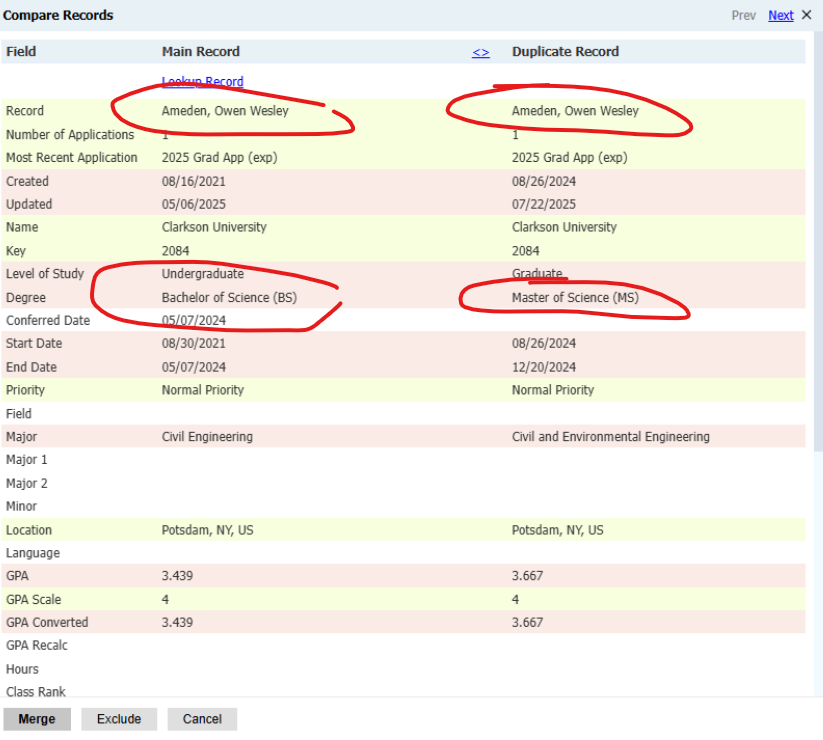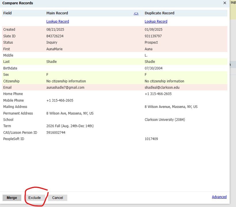 - This is what the record looks like when you open it. You want to make sure the information in both columns is the same…name…email, address, birthday, phone number…if it’s the same you click on merge on the bottom of the screen…if it does NOT match you click on exclude on the bottom of the screen