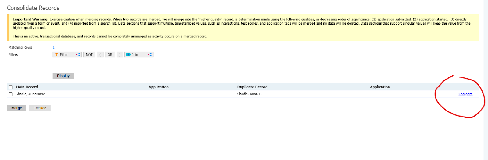 - Here’s what it looks like when you click on the first arrow under persons. Click on compare by the first applicants name on the right and the is what the screen will look like.
