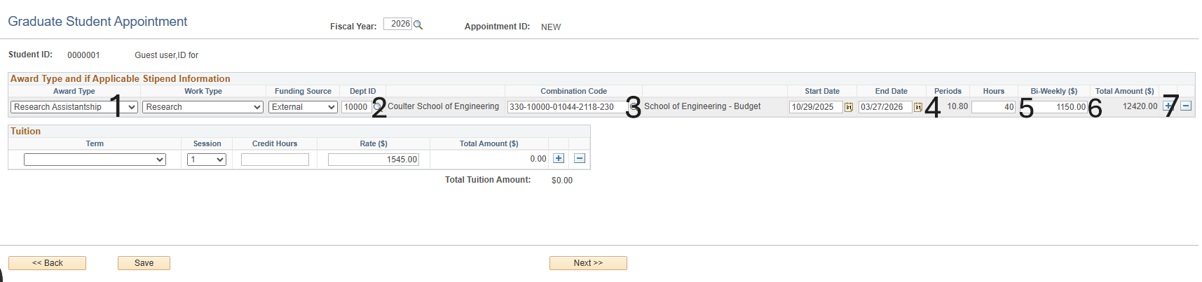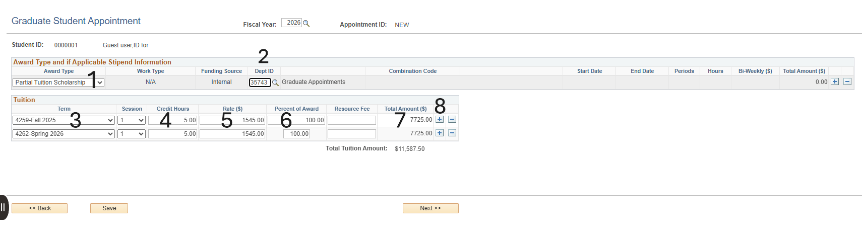 The information in this next step will be for a TA or RA appointment. For information on how to add Partial Tuition Scholarship information, jump down to the blue box.