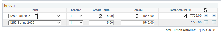- Rate will automatically fill in $1545, however some programs charge $1050/credit, be sure that the credit rate is correct before continuing