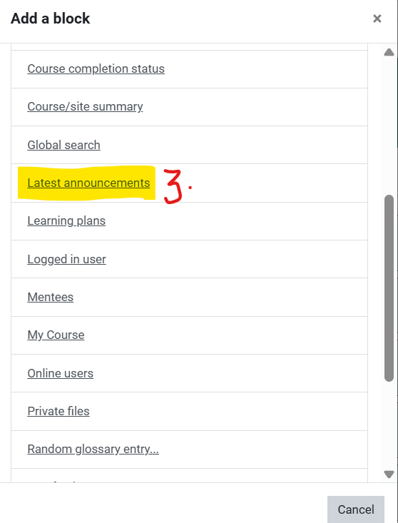 Scroll down in the Add a block tool and choose the Latest Announcements block: