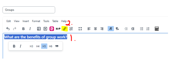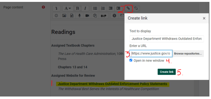 Quality Matters and Universal Design guidelines state that when linking to the Internet, use descriptive text and link the text rather than pasting a URL. See instructions for creating an active hyperlink on a Moodle Section, Page, Label (Text/Media), Quiz, Forum and more. The process is slightly different depending on if you use the TinyMCE Legacy editor or the Atto editor, as shown below.