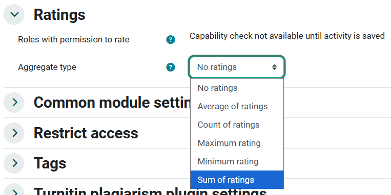 - The gradebook calculates a grade based on the chosen aggregate type (average, sum, maximum, minimum, count) for the ratings.