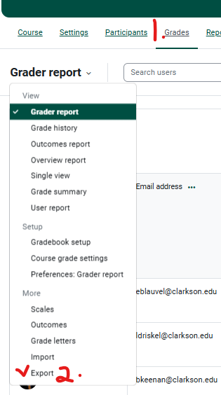 Note this video demo is Moodle 4 so the screens will not match newer versions of the LMS. The key piece to get started is to click the link to Grades on the top navigation bar in the course and click Export. The steps below show Moodle 4.5 screenshots.