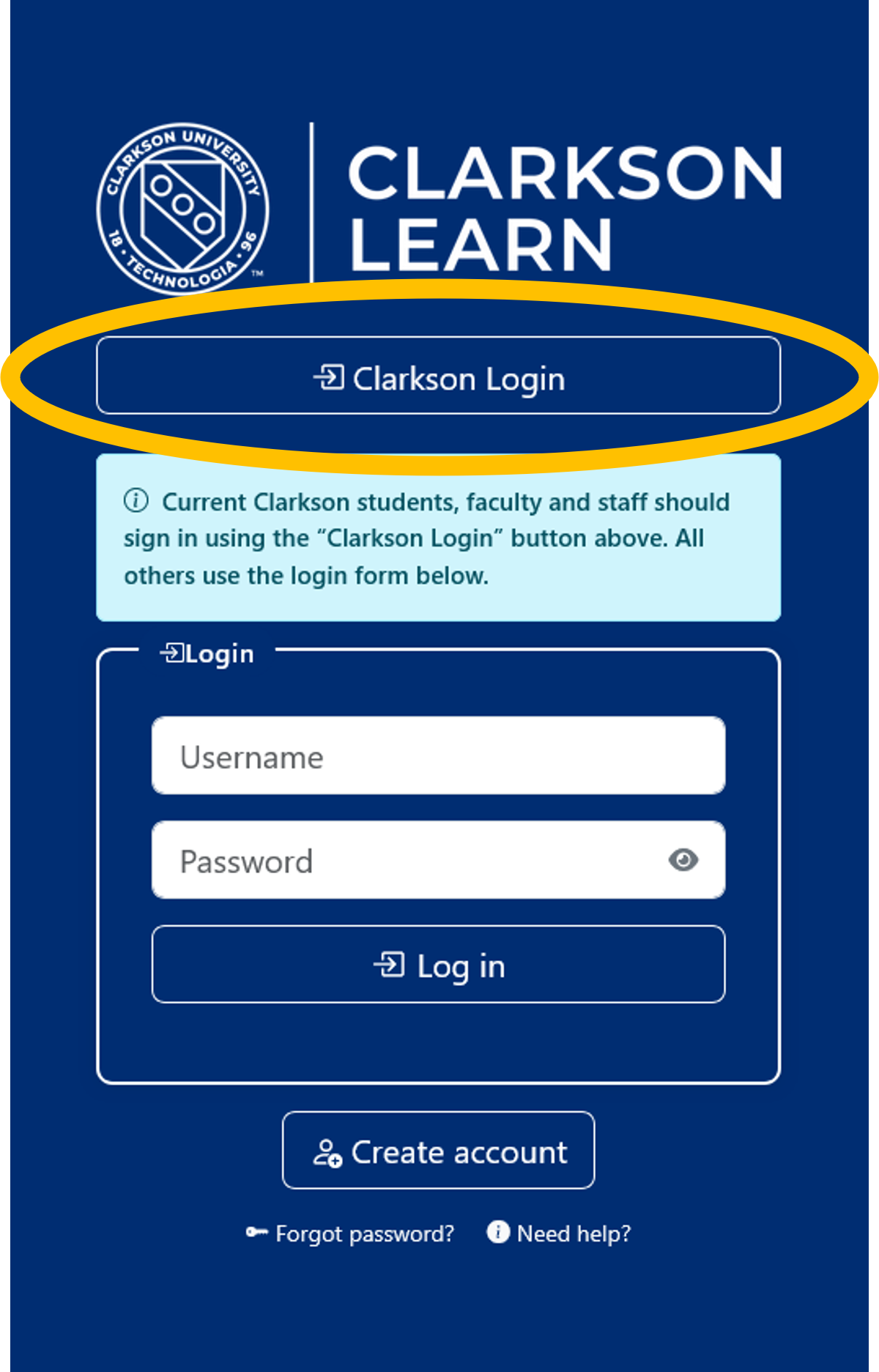 Current Clarkson Students, Faculty or Staff: If you have an active clarkson.edu email address, you must enter learn.clarkson.edu using the Student, Faculty & Staff. Simply login with Clarkson email button on the Welcome start page found here: https://learn.clarkson.edu/