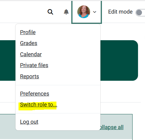 How do I switch my role to student so that I can see the course as they see it?