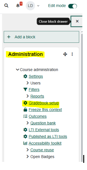 - On the right side of the page, in the "Administration" block select "Gradebook Setup".