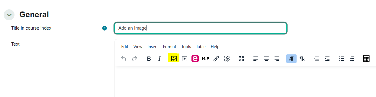 If you are using the Atto editor you will see the tools below. If your editor looks different from the one below, you are probably using the Tiny MCE editor. Adding an image is similar in both. Images can be added almost anywhere you have a text editor.