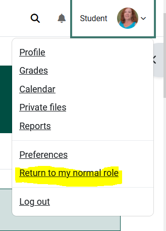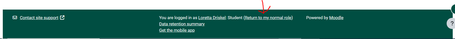 - Alternatively, scroll to the bottom of the Moodle page and click the link to "Return to my normal role"