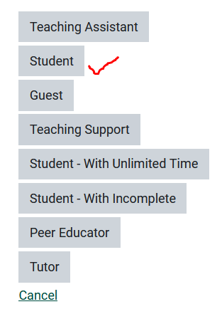 Choose a role to get an idea of how someone with that role will see this course. Please note that this view may not be perfect (See details and alternatives).
