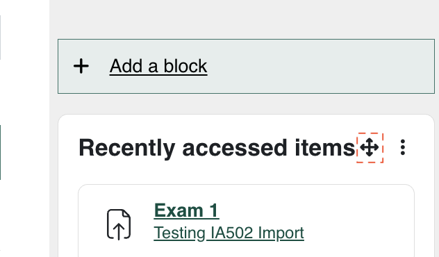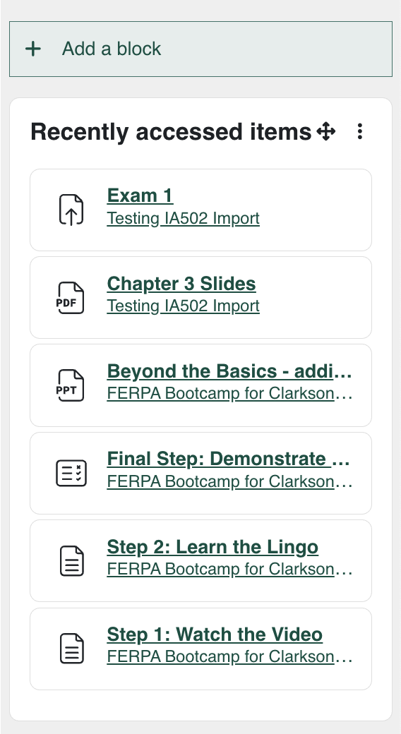 3. Once clicked, It will appear in your sidebar on top of the other blocks. Now you can see any recent documents/uploads you have accessed. You can repeat this step with any of the widget you want to see on your dashboard/sidebar