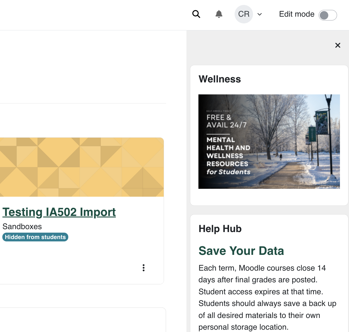 1. On your Moodle dashboard, locate the edit mode button in the top right corner and click to turn it on. Once done so, you will see a green banner reading "Add a block".Screenshot 2025-06-15 at 3.14.24 PM.png