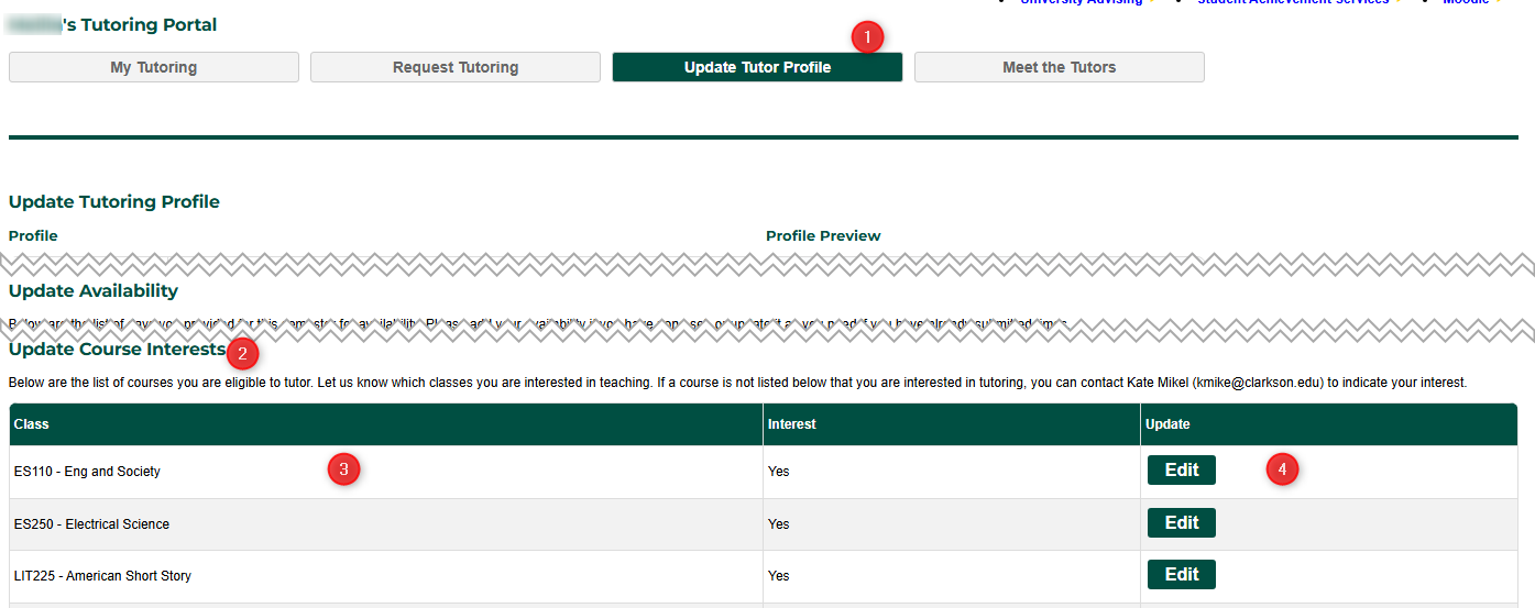 - From your My Tutoring portal (go.clarkson.edu/tutoring), scroll to your "Update Tutor Profile" section