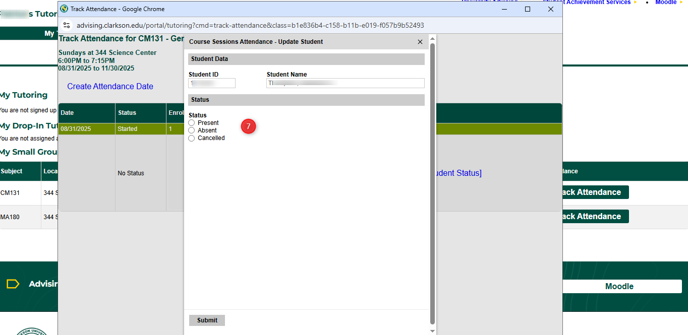 - In the new popup, you will see the students ID and Name for reference. Choose the status and hit Submit.